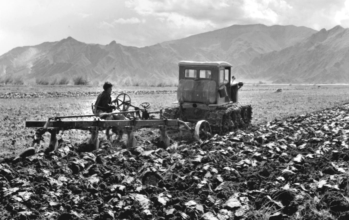 1964年,農(nóng)民使用拖拉機(jī)在拉薩郊外進(jìn)行秋耕。青藏公路和川藏公路通車后,許多新式農(nóng)具通過(guò)公路運(yùn)到了西藏。