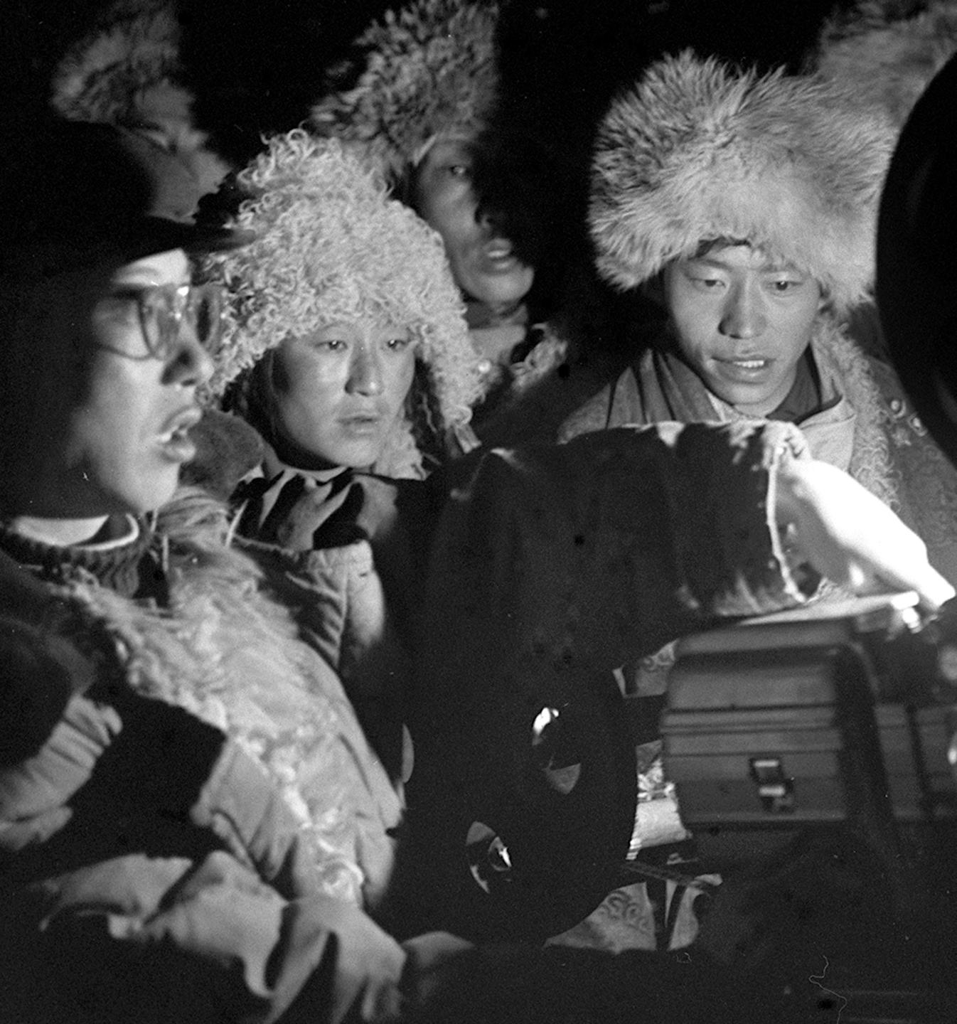1964年,西藏安多縣的牧民們圍著電影放映機(jī),等待電影開(kāi)演。川藏、青藏公路通車后,沿路地區(qū)面貌一新,曾經(jīng)荒僻的地方,居民們也能看到電影了。
