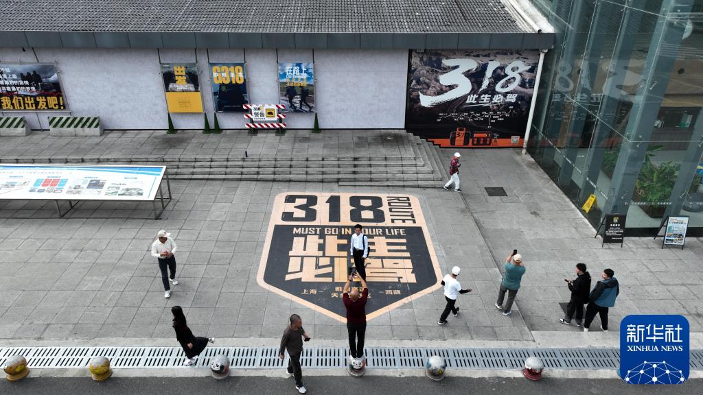 2024年10月27日,游客在雅康高速天全服務區(qū)地標圖案前拍照(無人機照片)。新華社記者 胥冰潔 攝