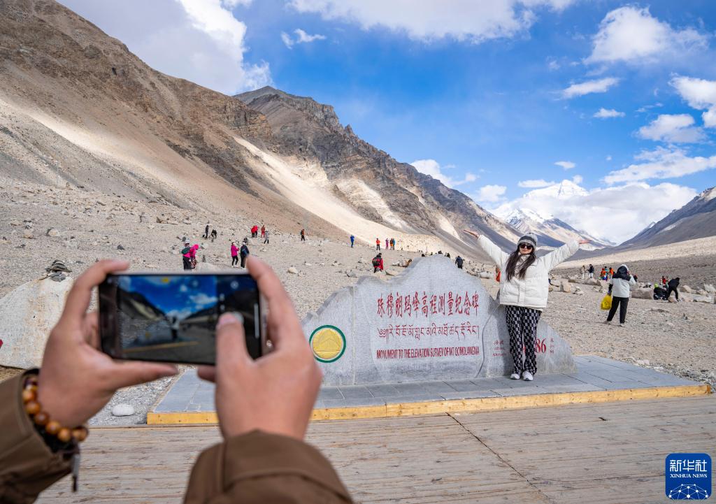 2024年5月24日,游客在珠穆朗瑪峰高程測量紀念碑前拍照留念。新華社記者 孫非 攝