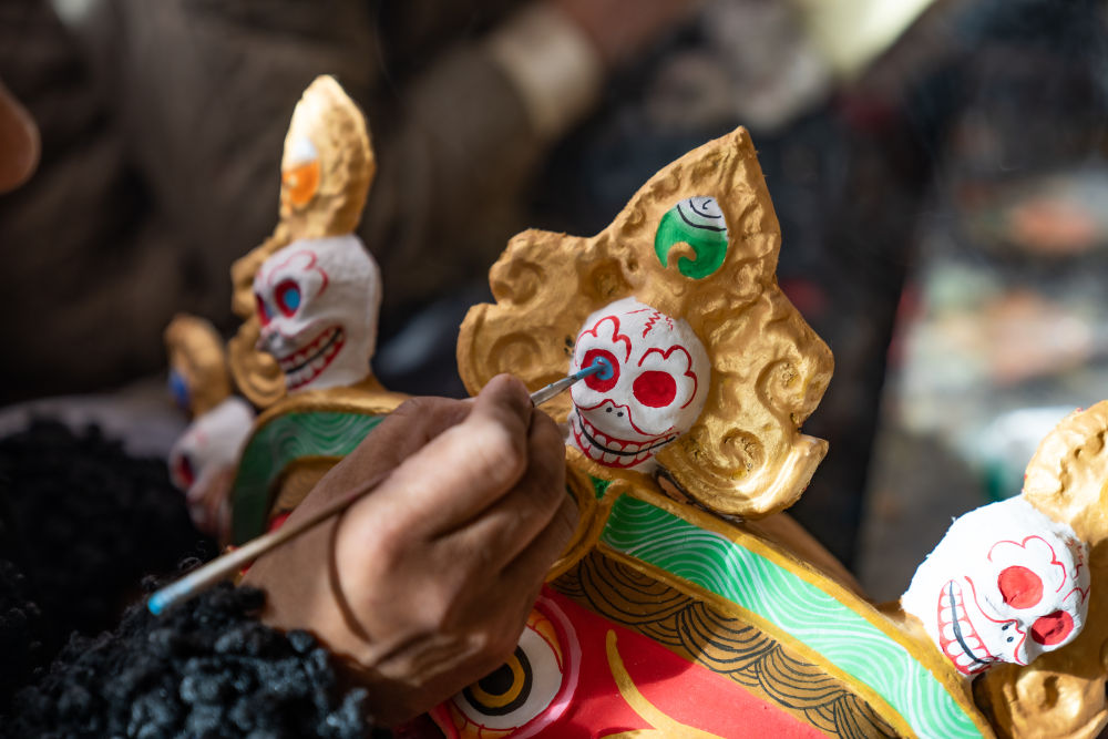 20世紀(jì)90年代,西洛就跟隨師父在西藏各地制作藏戲面具。一開始,他認(rèn)為面具制作只是一門糊口的手藝。但其實(shí)面具在藏戲表演中十分重要,演員表演藏戲時無需化妝,主要是戴面具表演。整體上看,藏戲分為白面具戲和藍(lán)面具戲。在同一臺藏戲中,又會出現(xiàn)紅、白、藍(lán)、黑、黃等不同顏色的面具,代表不同身份。