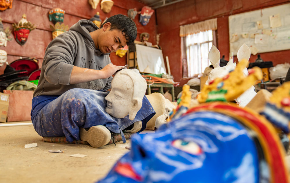 拉薩達(dá)孜區(qū)雪鄉(xiāng)民間傳統(tǒng)手工藝農(nóng)民專業(yè)合作社的面具制作工匠制作傳統(tǒng)面具。