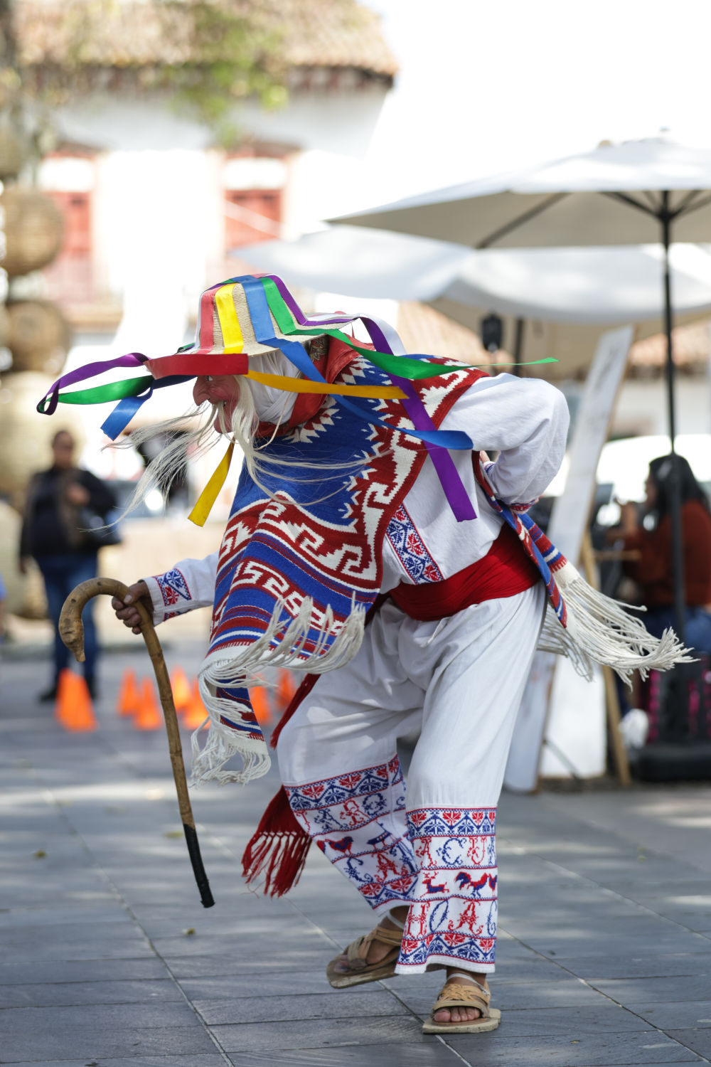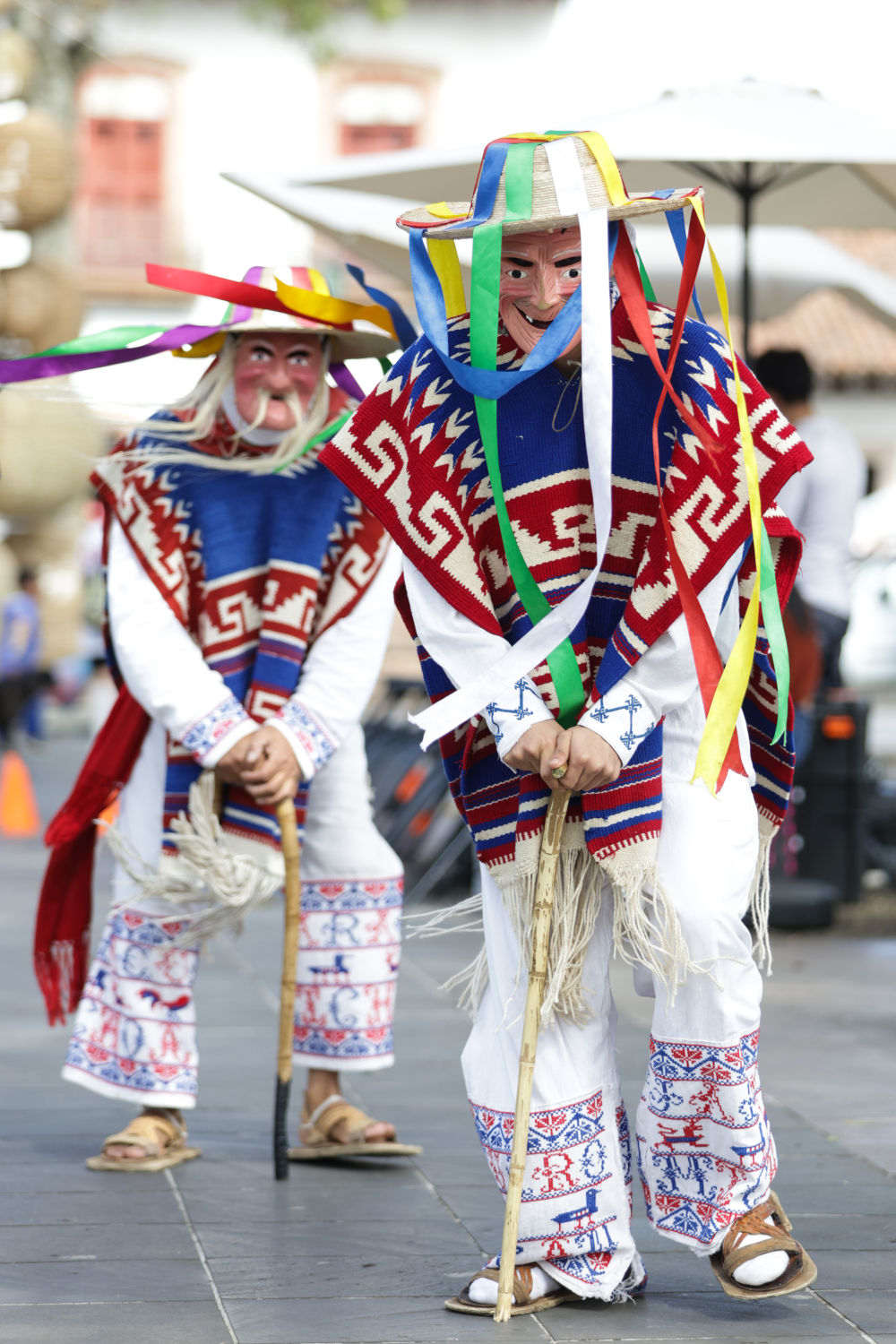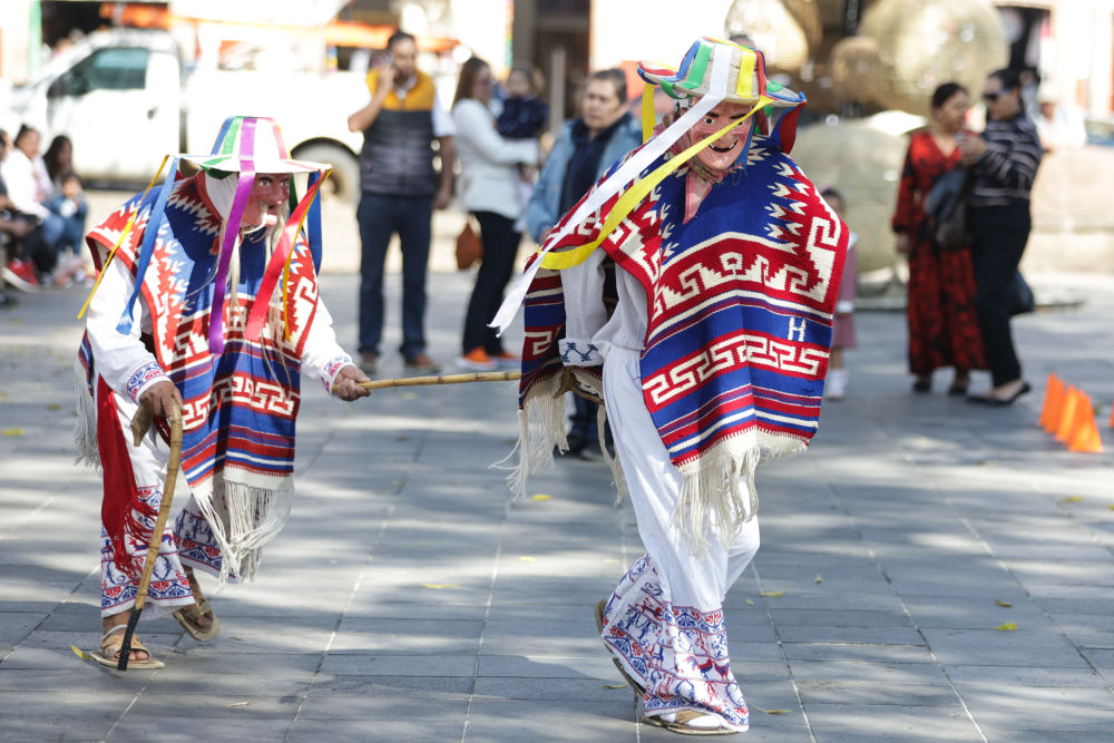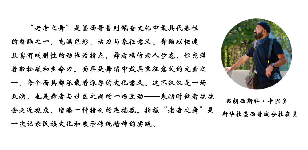 面具制作在墨西哥也有著悠久的歷史,有各式各樣的面具用于各種舞蹈和慶典。舞者表演“老者之舞”時往往配戴著略顯夸張的面具,面具通常帶有皺紋、胡須和微笑的表情,借以塑造一種看似滑稽、幽默卻充滿智慧的形象。除了老人面具,舞者表演時還會穿著傳統(tǒng)的普列佩查民族服飾,包括刺繡彩色披肩、白色農(nóng)民風(fēng)格的長衫和編織草帽,整體造型鮮艷、喜慶。舞蹈表演時舞者會模仿老人的步態(tài),以滑稽的方式彎腰駝背,手持拐杖或木棍,搖搖晃晃地邁步,同時做出靈活的跳躍和旋轉(zhuǎn)動作,展現(xiàn)一種出人意料的活力與生命力。