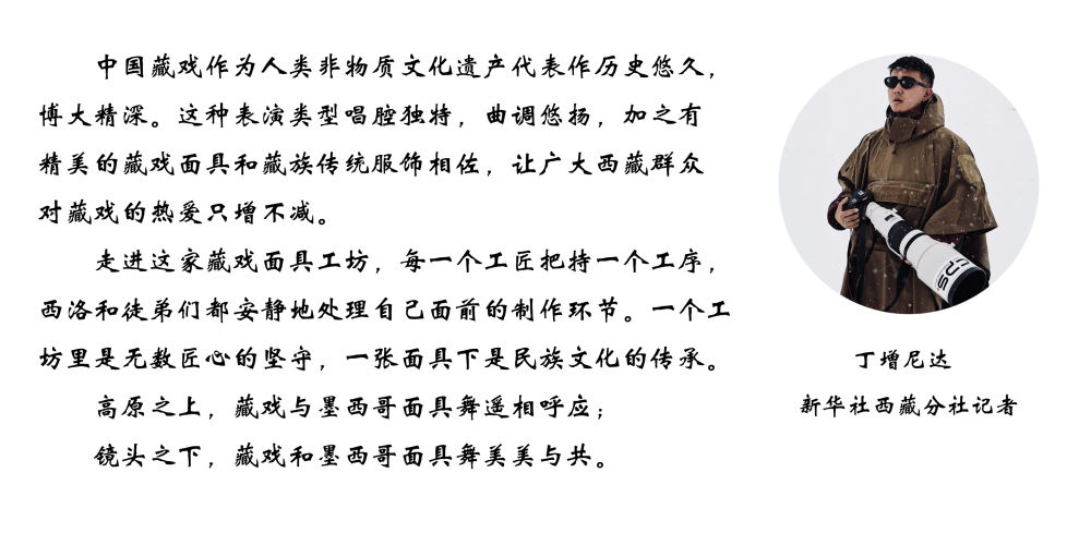 拉薩達(dá)孜區(qū)雪鄉(xiāng)民間傳統(tǒng)手工藝農(nóng)民專業(yè)合作社的工匠在合作社門前的空地上佩戴檢查做好的西藏傳統(tǒng)面具。