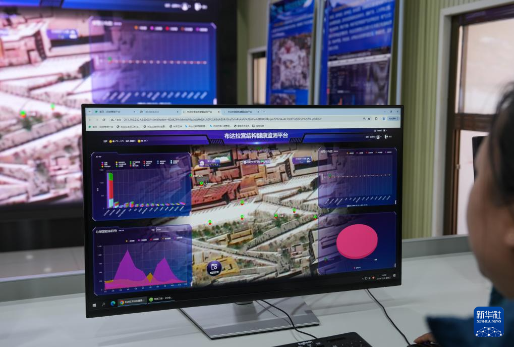 12月4日,布達(dá)拉宮監(jiān)測中心的工作人員在查看布達(dá)拉宮結(jié)構(gòu)健康監(jiān)測平臺。新華社記者 晉美多吉 攝