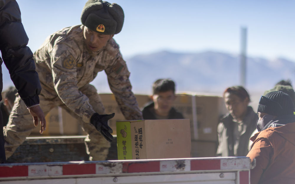 2025年1月8日,解放軍戰(zhàn)士在定日縣尼轄鄉(xiāng)雪龍村幫助受災(zāi)群眾搬運(yùn)生活物資。新華社記者 姜帆 攝