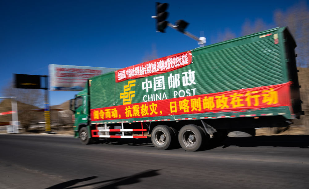 2025年1月8日,在日喀則,中國(guó)郵政的抗震救災(zāi)物資運(yùn)輸車(chē)輛向震中方向駛?cè)?。新華社記者 丁增尼達(dá) 攝