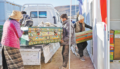 1月11日,西藏定日縣曲洛鄉(xiāng)措昂村,首批入住活動板房的村民正在搬運物品,為入住做準(zhǔn)備。記者 張武軍攝