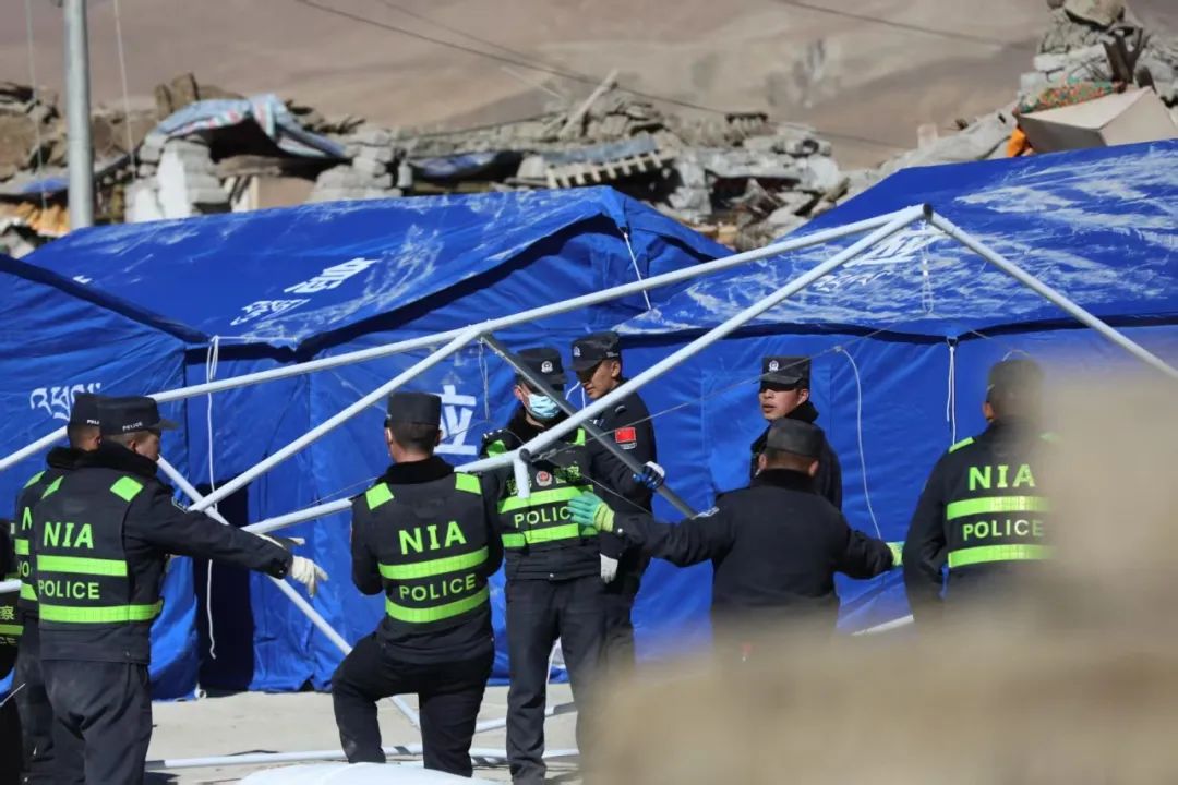 圖為日喀則邊境管理支隊(duì)民警在定日縣長所鄉(xiāng)玉白村安置點(diǎn)為群眾搭建帳篷。郭遠(yuǎn)敬 攝