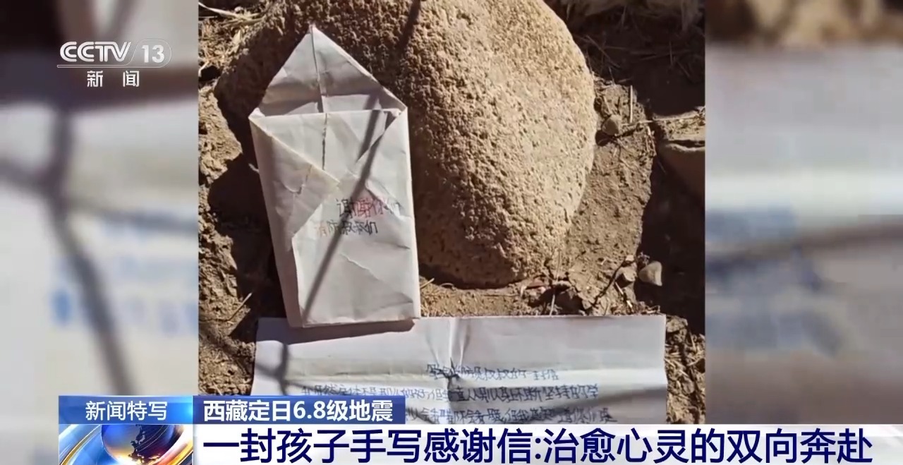 12日中午,消防員旦增赤列在曲洛鄉(xiāng)班久崗村安置點(diǎn)忙碌時,一個女孩突然將一個疊好的小紙包塞到他手里。裝信的紙包上寫著“謝謝你們,消防員叔叔”。