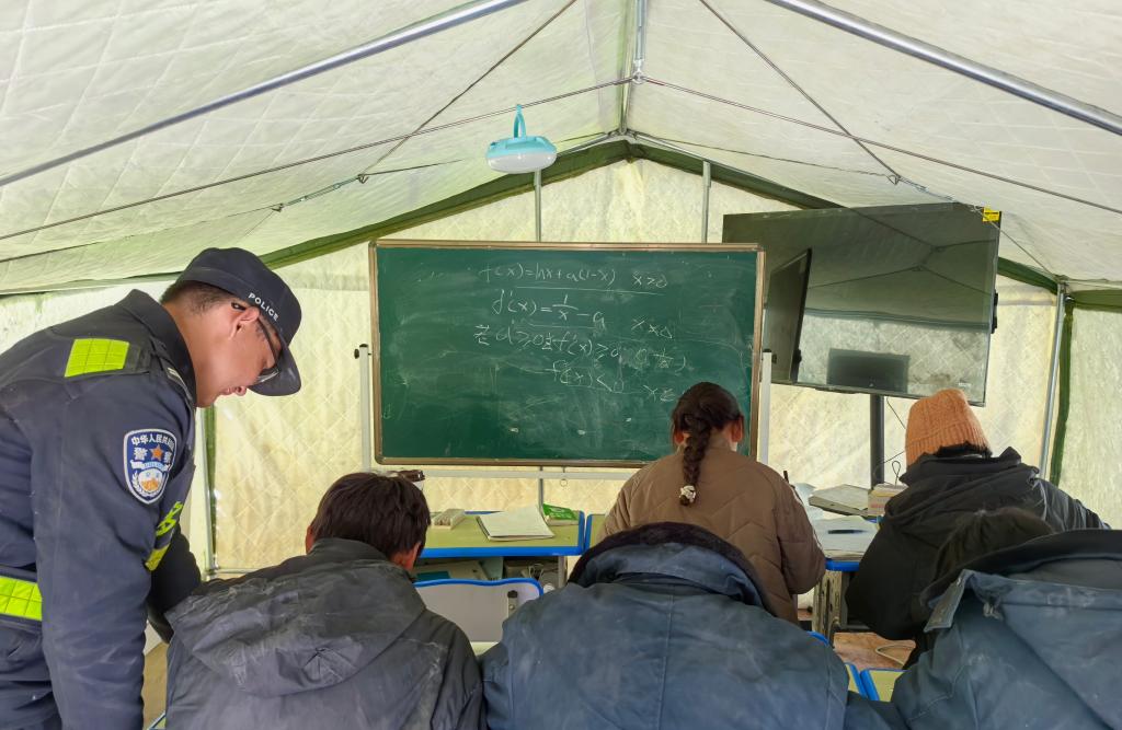 白天,“民警老師”輪流救援和授課;夜晚,他們擠在帳篷里,對(duì)著手機(jī)屏幕搜索習(xí)題資料,討論哪些題目適合學(xué)生練習(xí)。