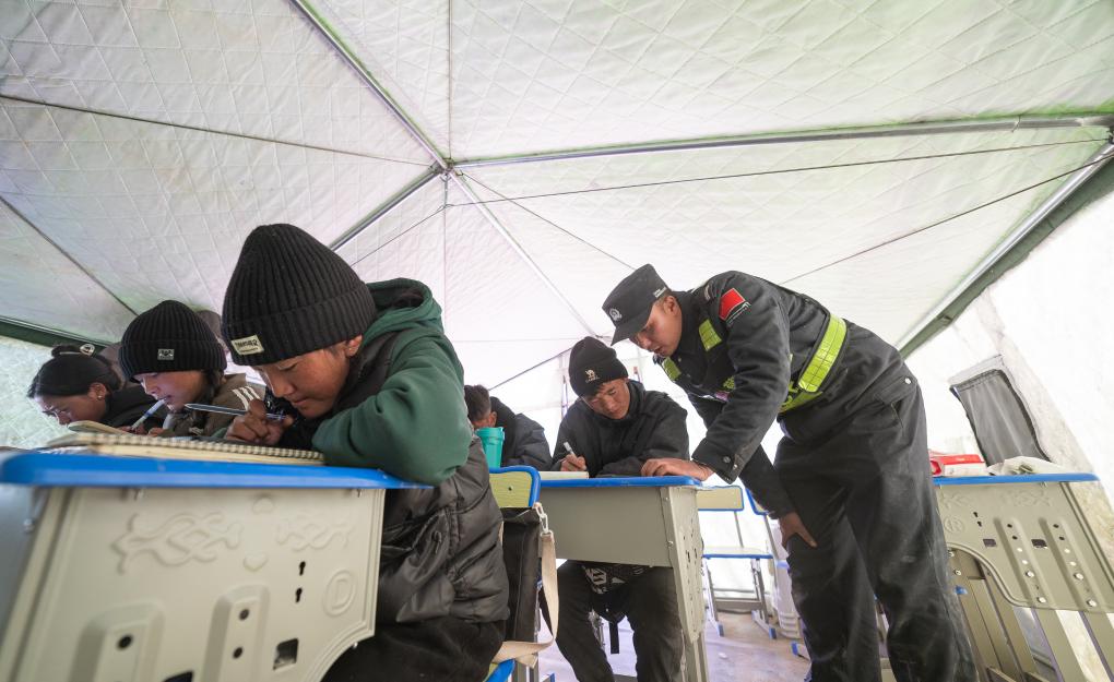 今年22歲的劉鑫磊,是西藏邊檢總站日喀則邊境管理支隊(duì)的一名新警。地震發(fā)生后,他和同事第一時(shí)間趕赴災(zāi)區(qū)救援。在救援工作進(jìn)入過(guò)渡期安置階段后,他們排查發(fā)現(xiàn),雜村、嘎布村和玉白村共有6名高三學(xué)生、8名初三學(xué)生。這些學(xué)生正處于備考關(guān)鍵期,而地震讓附近的幾個(gè)村子遭受重創(chuàng),房屋倒塌,孩子們的課本和練習(xí)冊(cè)幾乎全部被毀。面對(duì)接連不斷的余震和考試的壓力,這些學(xué)生需要的不只是生活上的幫助。