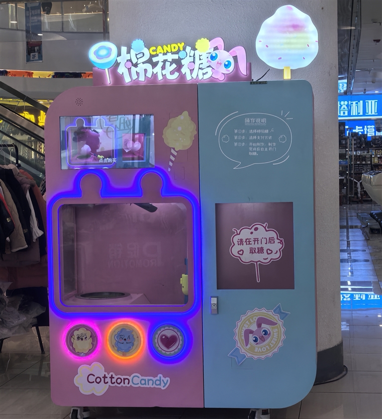除了自助游戲機(jī),自助棉花糖機(jī)也是一大亮點(diǎn)。在拉薩市多家大型商超內(nèi),自助棉花糖機(jī)成為了孩子們的新寵。記者走訪(fǎng)發(fā)現(xiàn),目前拉薩各大商場(chǎng)內(nèi)的棉花糖機(jī)大多為同一品牌,機(jī)子中的棉花糖有42種,一個(gè)棉花糖售價(jià)19.9元。市民可以根據(jù)口味、顏色、造型選擇棉花糖,操作流程也十分便捷,選購(gòu)后掃碼支付即可。