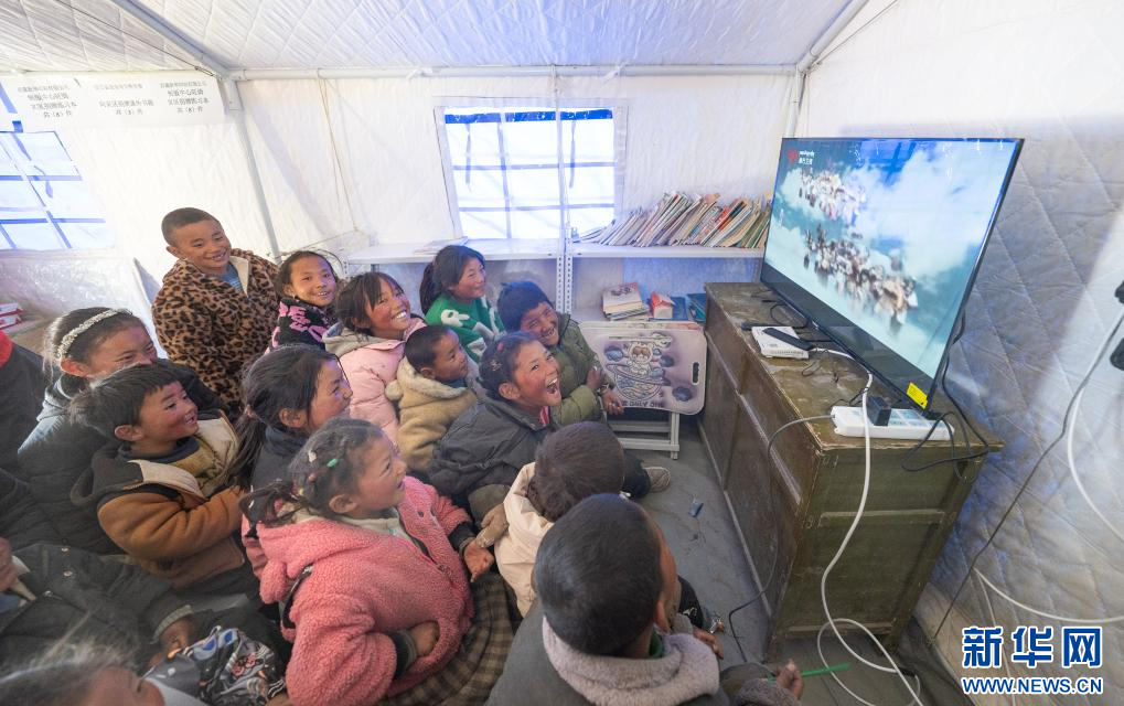 在定日縣長所鄉(xiāng)嘎布村,孩子們?cè)诳础段饔斡洝罚?月14日攝)。 新華社記者 丁增尼達(dá) 攝