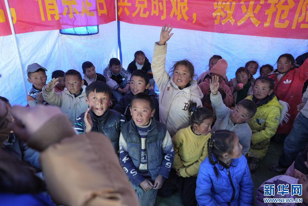 1月8日,塘仁村安置點(diǎn)的孩子們和社工老師們玩游戲,緩解心理壓力。新華社記者 晉美多吉 攝