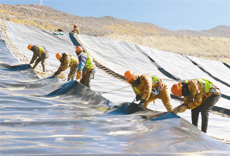 中鐵十七局集團(tuán)第二工程有限公司西藏巨龍德慶普項(xiàng)目現(xiàn)場(chǎng)工人正在拉薩市達(dá)孜區(qū)海拔5000米以上的施工區(qū)域進(jìn)行鋪膜防滲作業(yè)。