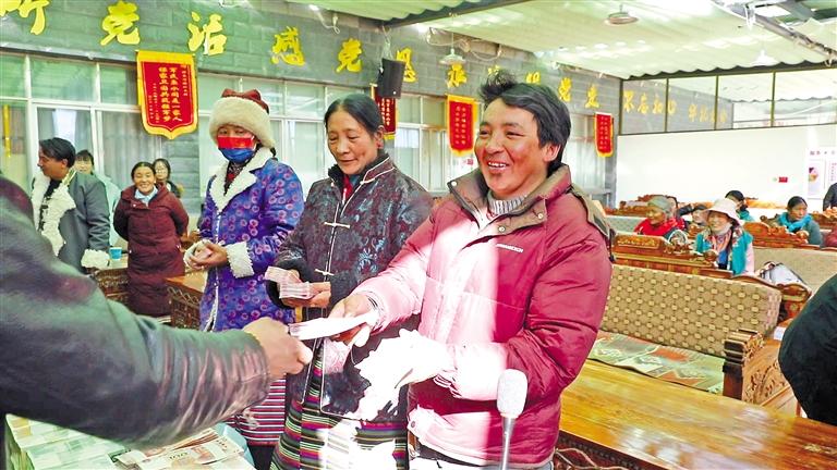 冬日的阿里,寒氣襲人,然而在獅泉河鎮(zhèn)加木村的黨員活動(dòng)室里,卻是暖意融融、熱鬧非凡。原來(lái),這里正在召開(kāi)村里的年終分紅大會(huì)。村合作社經(jīng)理洛桑達(dá)瓦首先向群眾介紹了合作社2024年的運(yùn)營(yíng)及收益情況,隨后按村民入股多少逐戶發(fā)放分紅款。看著手里的“真金白銀”,村民們個(gè)個(gè)笑得合不攏嘴。