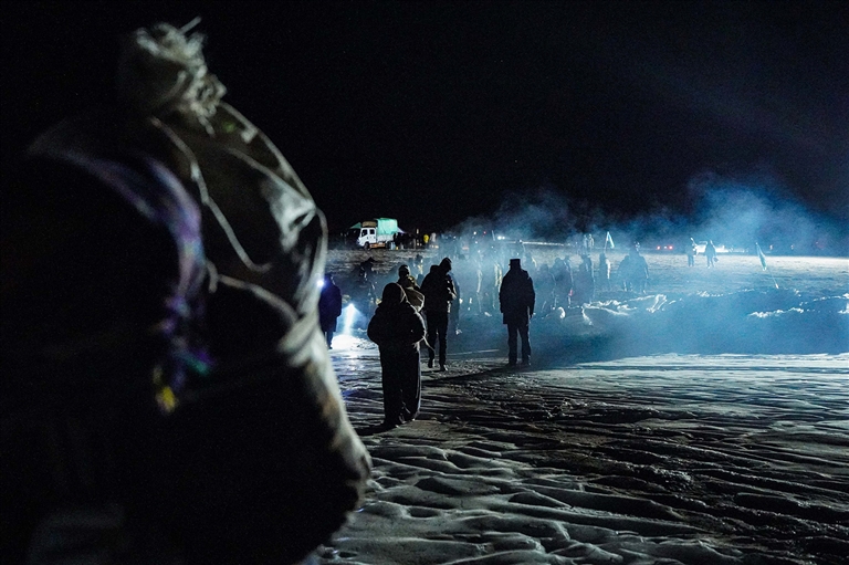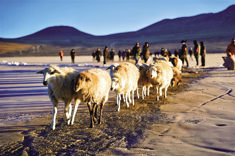 2月7日凌晨6點(diǎn),記者抵達(dá)普莫雍錯(cuò)。彼時(shí),滿(mǎn)天繁星閃爍,冰湖在星光映照下,幽藍(lán)深邃,宛如一片凝固的夢(mèng)幻之境。清晨的寒風(fēng)凜冽刺骨,可推瓦村的牧羊人們?cè)缫验_(kāi)啟了忙碌的一天。8點(diǎn),儀式結(jié)束,趕羊活動(dòng)正式拉開(kāi)帷幕。幾位牧羊人率先行動(dòng),在冰面上撒下?tīng)t灰,為的是給羊群鋪設(shè)“防滑步道”。一名牧羊人輕輕抱起小羊,率先踏上冰面,身后成群的羊緊隨其后,步伐緩慢而有序。冰面上,羊群細(xì)碎的腳步聲與冰層偶爾發(fā)出的輕微碎裂聲交織在一起,恰似大自然輕聲吟唱的歌謠。