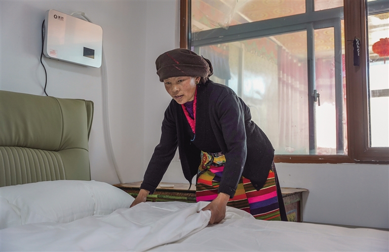 倫珠曲珍今年40歲,是這家的二女兒,15年前嫁到外村,每年都會(huì)回來(lái)看望父母。由于同行的人員出現(xiàn)高反癥狀,倫珠曲珍便主動(dòng)邀請(qǐng)記者到他們家的“高原暖心房”里休息調(diào)整?!案咴姆俊痹O(shè)置在她家客廳的里側(cè),屋內(nèi)寬敞明亮、干凈整潔。墻壁上的恒溫裝置讓屋子始終保持在宜人的20攝氏度左右?!拔覀兇蛟斓摹咴姆俊銣匦Ч貏e好,最高溫度能達(dá)到30多攝氏度。而且因?yàn)槭褂玫牟馁|(zhì)特殊,就算不開(kāi)恒溫裝置,幾個(gè)人待在屋里也不會(huì)覺(jué)得冷??纯催@些家具,都是村里愛(ài)心小屋提供的?!绷涡駯|介紹道。