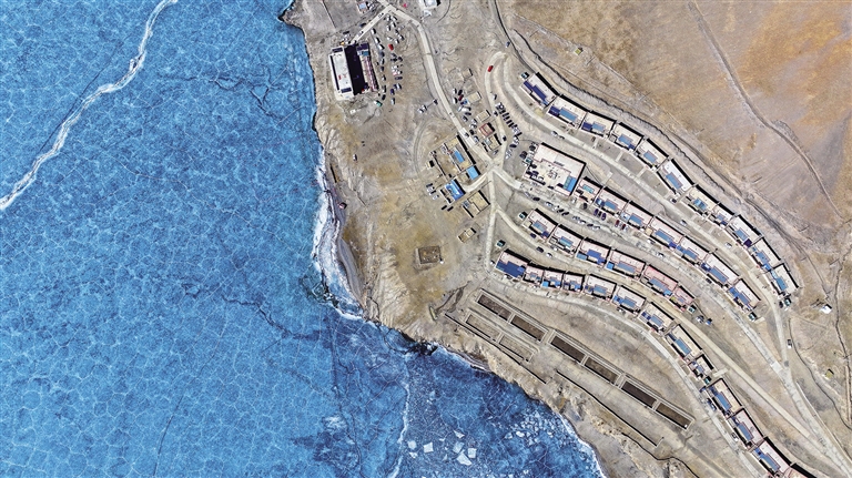 當(dāng)日,天空晴朗,在廣袤無(wú)垠、無(wú)樹木遮擋的曠野上,稍起一陣疾風(fēng),便會(huì)揚(yáng)起一層薄薄的黃沙。從村委會(huì)出發(fā),沿著冰湖畔的水泥小路前行,很快就來(lái)到了村民倫珠曲珍的家。一進(jìn)屋,厚實(shí)的木門便將凜冽的寒風(fēng)擋在了門外?!翱煺?qǐng)進(jìn),這幾天風(fēng)沙有點(diǎn)大,普莫雍措都沒(méi)以前藍(lán)了?!眰愔榍湟贿呹P(guān)門一邊熱情地笑著說(shuō)道。