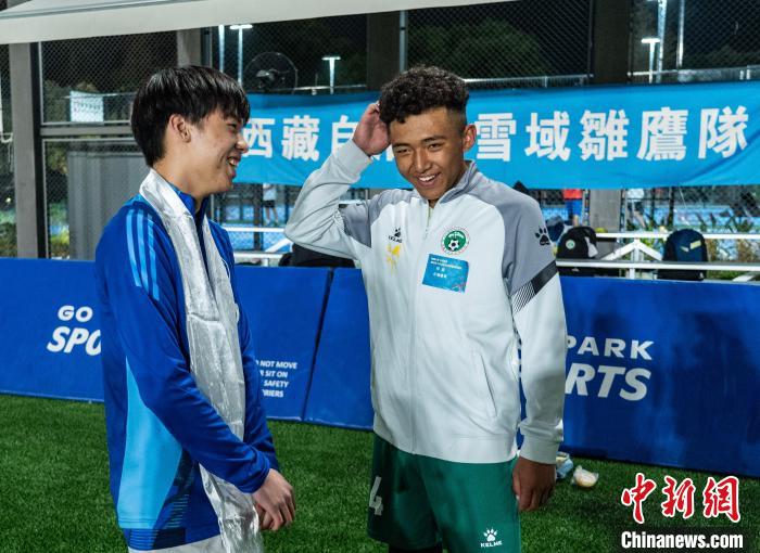 圖為雪域雛鷹隊(duì)隊(duì)員丹增云旦(右)賽后和香港東方U16隊(duì)隊(duì)員何本彥交流。中新社記者 侯宇 攝