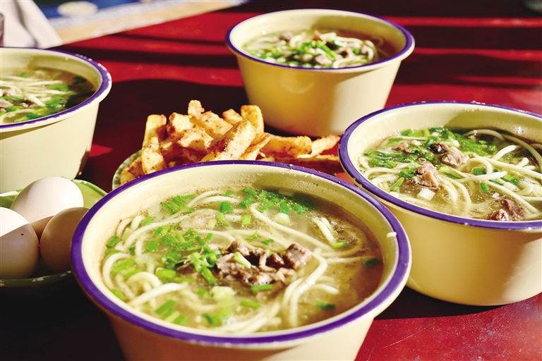 在西藏,人們總能將簡(jiǎn)單的食材做出獨(dú)一無(wú)二的“西藏味道”。一壺甜茶,一碗藏面,一份炸土豆或肉餅,便是這里最標(biāo)準(zhǔn)的早餐套餐。清水、紅茶茶葉、甜奶粉或牦牛奶,只需簡(jiǎn)單的食材,便能制作出茶香濃郁、奶味醇厚的甜茶。在略帶寒意的初春,喝上一口,整個(gè)身子都暖了起來(lái)。此時(shí)搭配一碗筋道的藏面,簡(jiǎn)單又滿(mǎn)足。