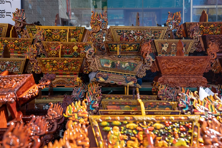 “老板,這個(gè)切瑪盒多少錢?便宜點(diǎn)我就拿走了?!薄斑@個(gè)圖案樣式都是精心雕刻的,最低1300元,實(shí)在不能再少了?!贝稳实牡赇伹埃簧兕櫩驼谔暨x“切瑪盒”,生意很是火爆?!扒鞋敽小笔菍⒕贫沸文竞杏酶舭宸珠_(kāi),左右兩邊分別盛入炒青稞和糌粑,再插上象征五谷豐登的“羅薩梅朵”和寓意吉祥的酥油花,寓意人壽年豐、吉祥如意,是藏歷新年家家戶戶必備的年貨之一。次仁告訴記者,“切瑪盒”根據(jù)圖案、顏料、大小、木材等因素,售價(jià)從幾百元到上千元不等,很多顧客普遍喜愛(ài)傳統(tǒng)樣式與圖案。
