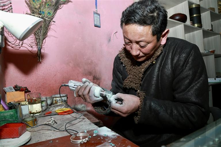 “叮叮當(dāng)當(dāng)……”近日,記者走進(jìn)墨竹工卡縣尼瑪江熱鄉(xiāng)宗雪村,被一陣短促而有力的敲打聲吸引。循聲而入,記者來(lái)到恰扎飾品加工店,展示架上琳瑯滿目的首飾讓人目不暇接:阿吉祖玉、銀手鐲、銀戒指、銀碗……