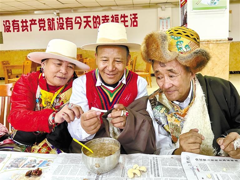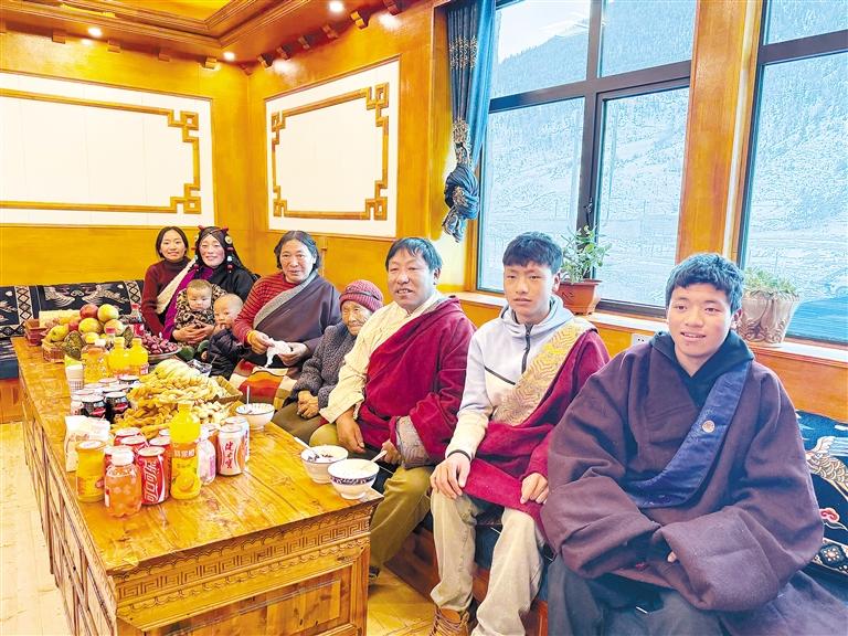 60歲的多吉大爺放牧歸來,推開家門,“古突”的香氣瞬間將疲憊驅散?!岸嫉烬R啦,吃‘古突’嘍!”大兒子格桑多吉一邊招呼,一邊給家人盛上“古突”。房間里,歡聲笑語不斷,處處充滿溫情。
