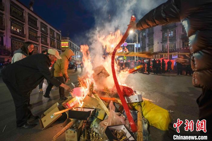藏歷新年是西藏傳統(tǒng)民俗活動(dòng),也是中國(guó)國(guó)家級(jí)非物質(zhì)文化遺產(chǎn)。2月27日,西藏迎來(lái)一年一度的藏歷新年古突夜(類(lèi)似春節(jié)的除夕),如今過(guò)古突夜,西藏民眾在點(diǎn)燃火把的同時(shí),也會(huì)燃放煙花,古城拉薩煙花璀璨。圖為2月27日晚,吃完古突(一種藏式面食)后,拉薩市民在街頭燃燒火把、燃放鞭炮等,迎接藏歷新年的到來(lái)。中新社記者 江飛波 攝