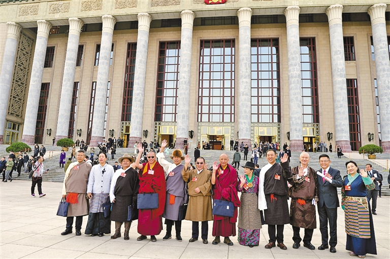 圖為住藏全國(guó)政協(xié)委員身著盛裝、滿懷豪情,在人民大會(huì)堂前合影留念。記者 丹增平措 攝