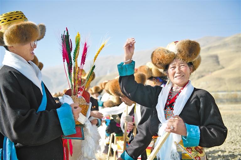 山南市瓊結縣拉玉鄉(xiāng)村民拋撒糌粑。通訊員 米瑪央金 倫珠澤仁 攝