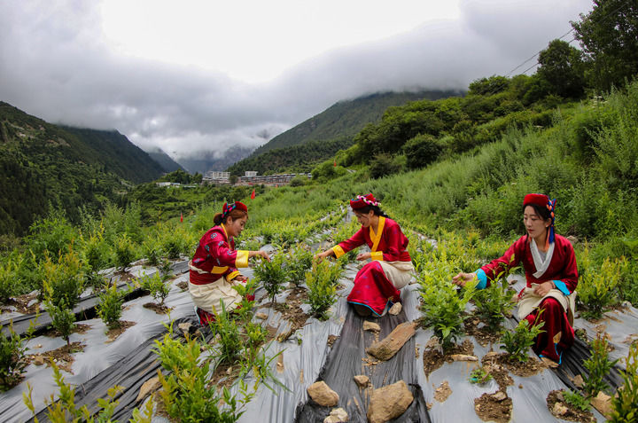 2022年,安徽省援藏工作隊在勒布溝引入莓茶種植,試驗性種植30畝。這是當?shù)卮迕裨诓烧瑁?023年7月28日攝)。新華社記者 旦增尼瑪曲珠 攝