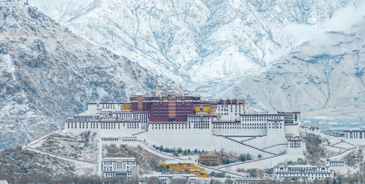 2月16日,無人機(jī)拍攝的布達(dá)拉宮的雪景。(圖片來源:新華社)