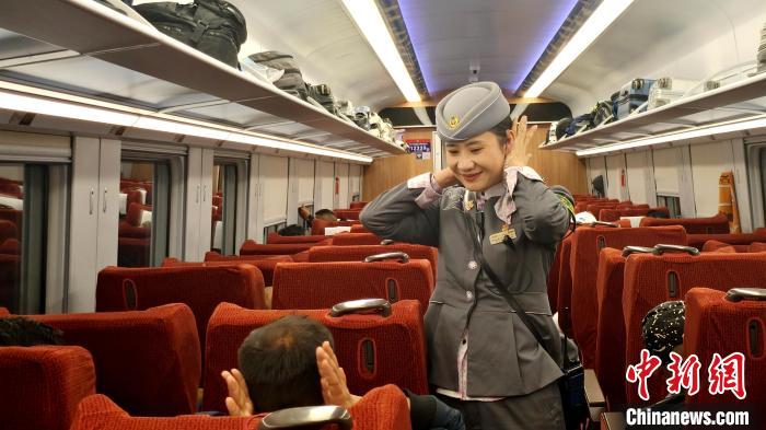 圖為譚珍帶著旅客做耳鳴操,緩解旅客在經(jīng)過隧道時的耳鳴癥狀。貢桑拉姆 攝