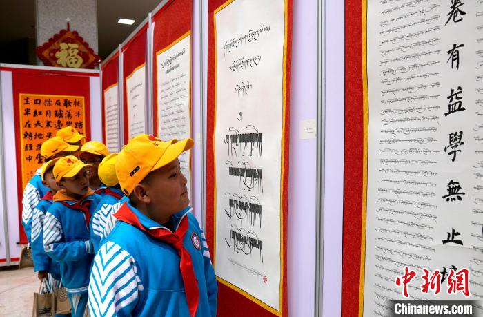 圖為小學生在圖書館大廳,參觀“傳承與創(chuàng)意”第五屆書法作品展。李林 攝