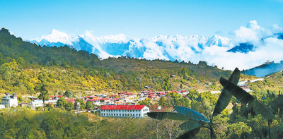 格林村與遠處的雪山、近處的森林共同構(gòu)成一幅生態(tài)畫卷。黃家斌攝