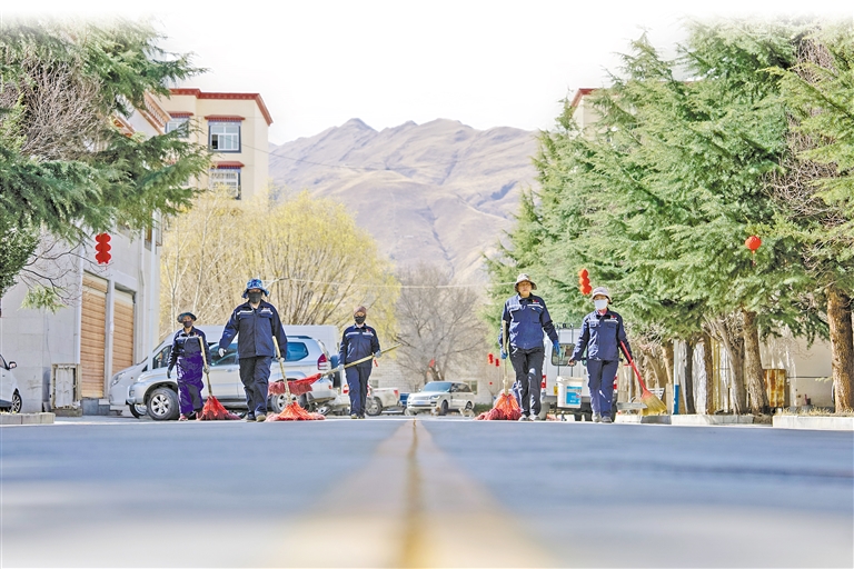物業(yè)服務(wù)部保潔團(tuán)隊在清掃小區(qū)道路。記者 阿旺尼瑪 攝