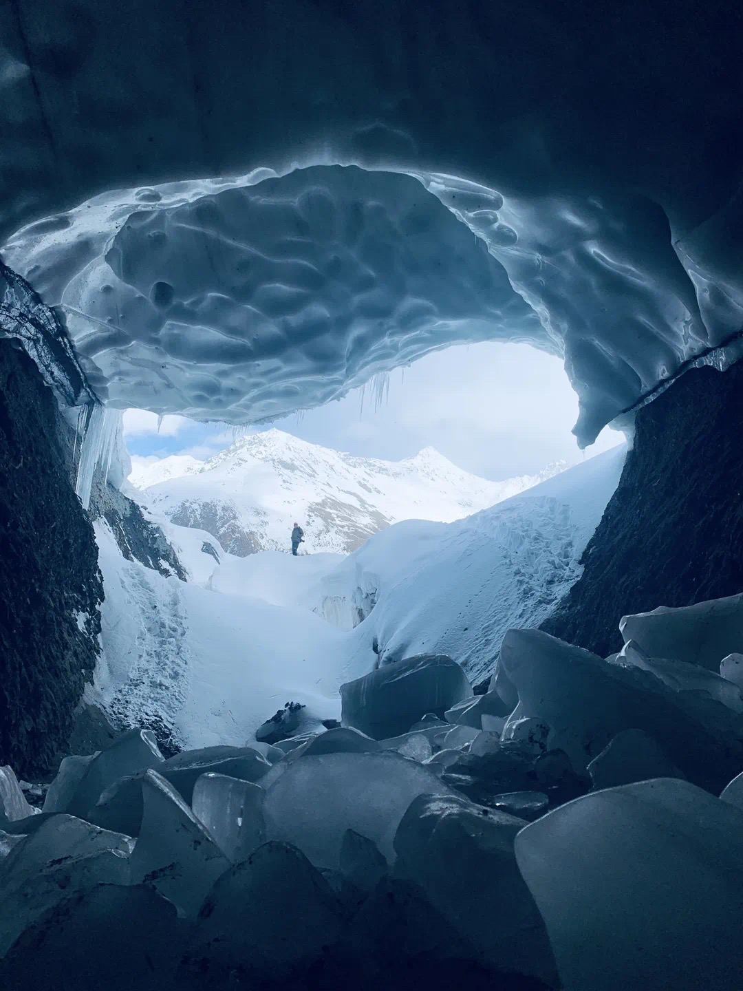冰洞入口高約1米,需要彎著腰才能進(jìn)入。待完全進(jìn)入后,空間逐漸開闊,冰洞內(nèi)別有洞天。冰壁深處透著蔚藍(lán),似是把邊壩的藍(lán)天鎖了進(jìn)去。冰洞最開闊的地方有一處冰臺(tái),游客在那里打卡拍照,記錄下這絕美的風(fēng)光。