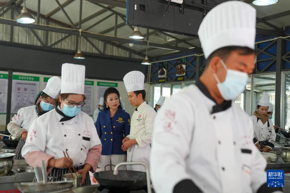 邊巴卓噶在烹飪技能班品嘗點(diǎn)評(píng)學(xué)員制作的菜肴(4月23日攝)。新華社記者 晉美多吉 攝