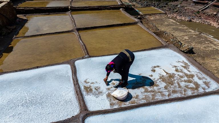 走進(jìn)加達(dá)村,便見(jiàn)村口的小攤位,那是加達(dá)村村民曲珍的鹽攤。曲珍從6歲開(kāi)始便跟著母親下鹽井,“以前每天凌晨三四點(diǎn)起床,一直要干到晚上十點(diǎn)多才結(jié)束,現(xiàn)在有抽水泵就方便了很多?!庇捎诩彝ピ颍錄](méi)有上過(guò)學(xué),一直跟著母親制鹽,所以對(duì)制鹽工序如數(shù)家珍。曲珍告訴記者,井鹽生產(chǎn)流程大致包括取鹵、濃縮、注鹵、曬鹽、晾鹽、收鹽、運(yùn)銷、修整鹽田等。傳承千年的制鹽技術(shù),就是從鹽井汲取鹵水倒入貯鹵池存放5—6天,將貯鹵池中的鹵水灌注到鹽田中,依靠風(fēng)吹日曬析出鹽粒。而后,將結(jié)晶的鹽刮成弧形以充分脫水。每年的11月至次年6月為曬鹽季,其中3-5月為旺季。