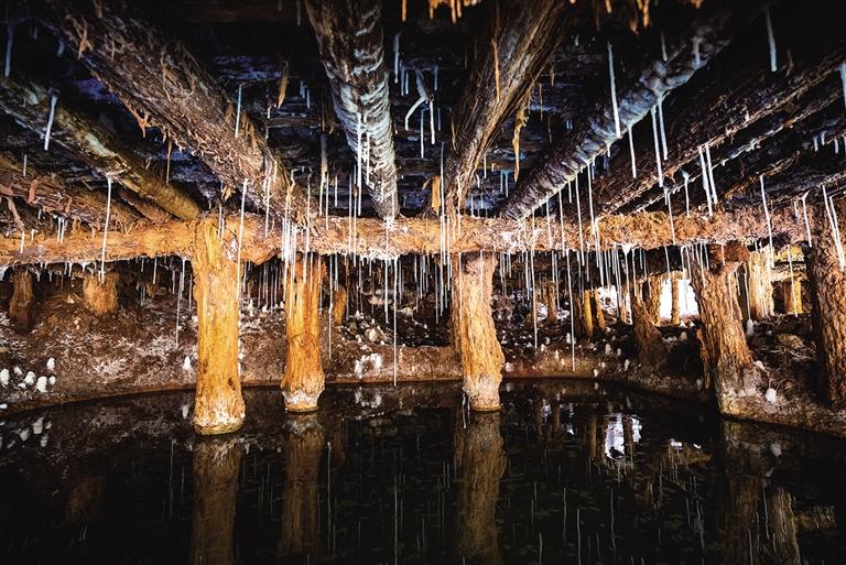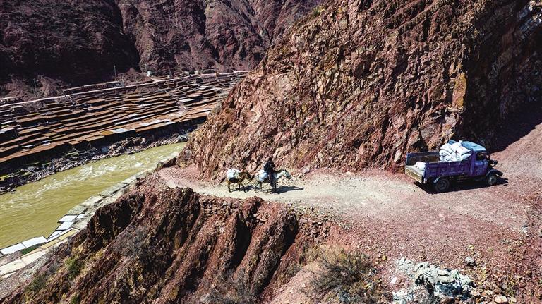 鹽田上,60歲的乃柯正和丈夫一起用木拍夯實(shí)鹽田。“現(xiàn)在用泵抽水輕松多了,但拍鹽田的手藝不能丟?!崩先说脑捳Z(yǔ)中,既有對(duì)科技的接納,也有對(duì)傳統(tǒng)的堅(jiān)守。鹽田下方,鹽晶垂落成簾,在山風(fēng)拂動(dòng)下閃爍微光,仿佛在訴說(shuō)著千年文明的厚重。