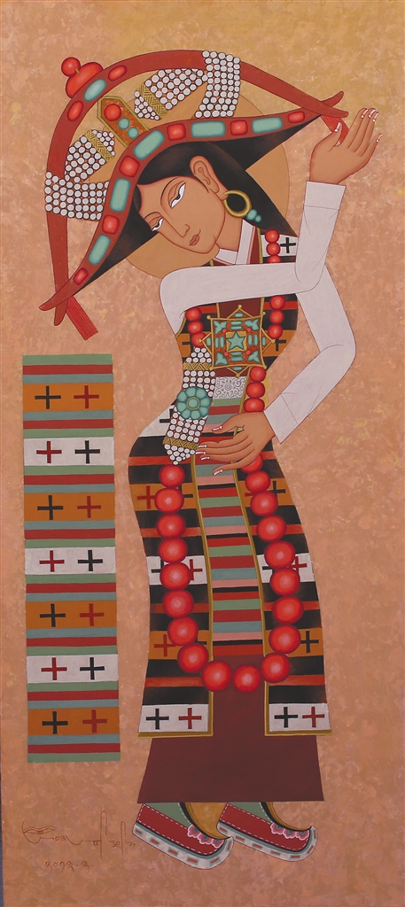 在昂?!皞鹘y(tǒng)當(dāng)隨時(shí)代”的藝術(shù)理念浸潤(rùn)下,徒弟們總能在傳統(tǒng)與當(dāng)代的碰撞中找到獨(dú)特的表達(dá)坐標(biāo):來自日喀則的藝術(shù)家多吉次旺,早年被昂桑畫作中藏文元素與抽象色塊的融合所震撼。如今在拉薩創(chuàng)辦工作室的他,正將藏文書法的中鋒筆觸解構(gòu)為流動(dòng)的視覺符號(hào)——烏金體的頓挫韻律幻化為色彩的潮涌,在畫布上重現(xiàn)古老史詩的“當(dāng)代心跳”;而主演《文成公主》實(shí)景劇的馮佳,這位四川傳媒大學(xué)表演系的畢業(yè)生,跟隨昂桑學(xué)畫四年,已能在《文成公主》系列中將唐卡礦物顏料的莊重與波普藝術(shù)的色塊切割并置,讓歷史人物既保有壁畫般的莊重感,又流淌著屬于時(shí)代的視覺節(jié)奏。