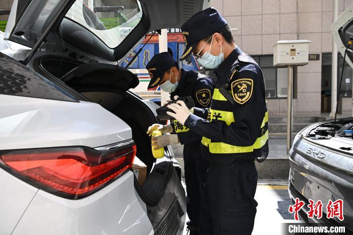 圖為西藏自治區(qū)日喀則市吉隆縣的吉隆口岸,海關工作人員在對出口的國產(chǎn)新能源汽車進行檢查。貢嘎來松 攝