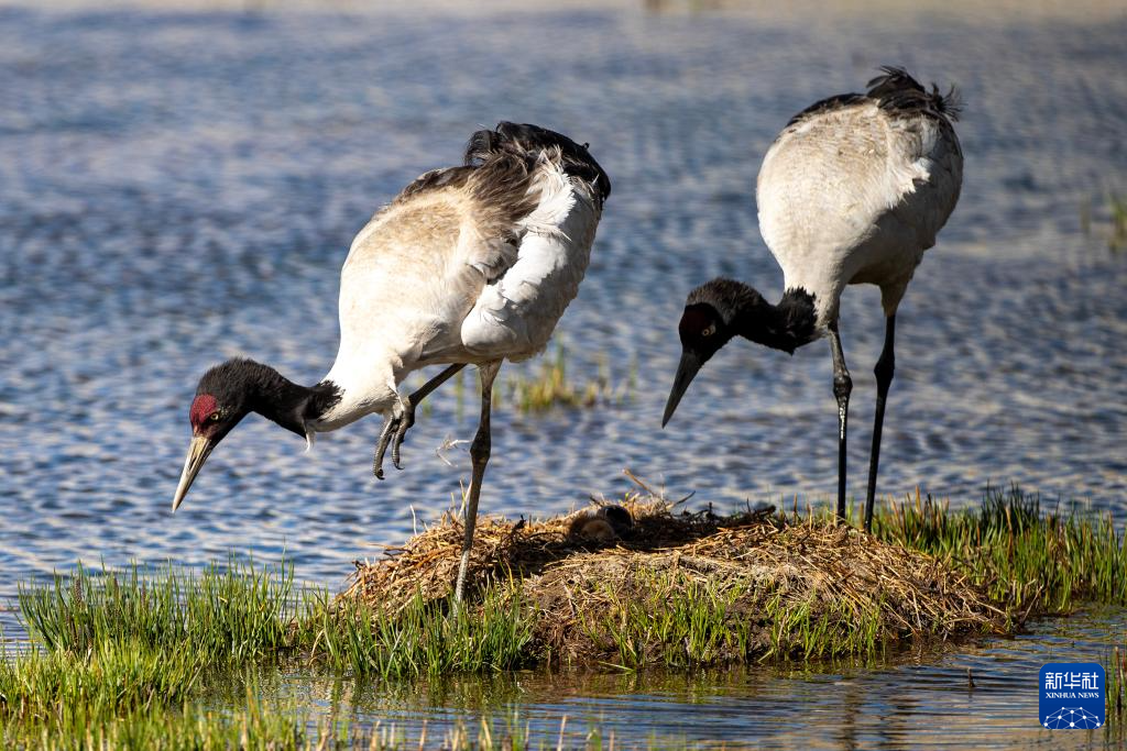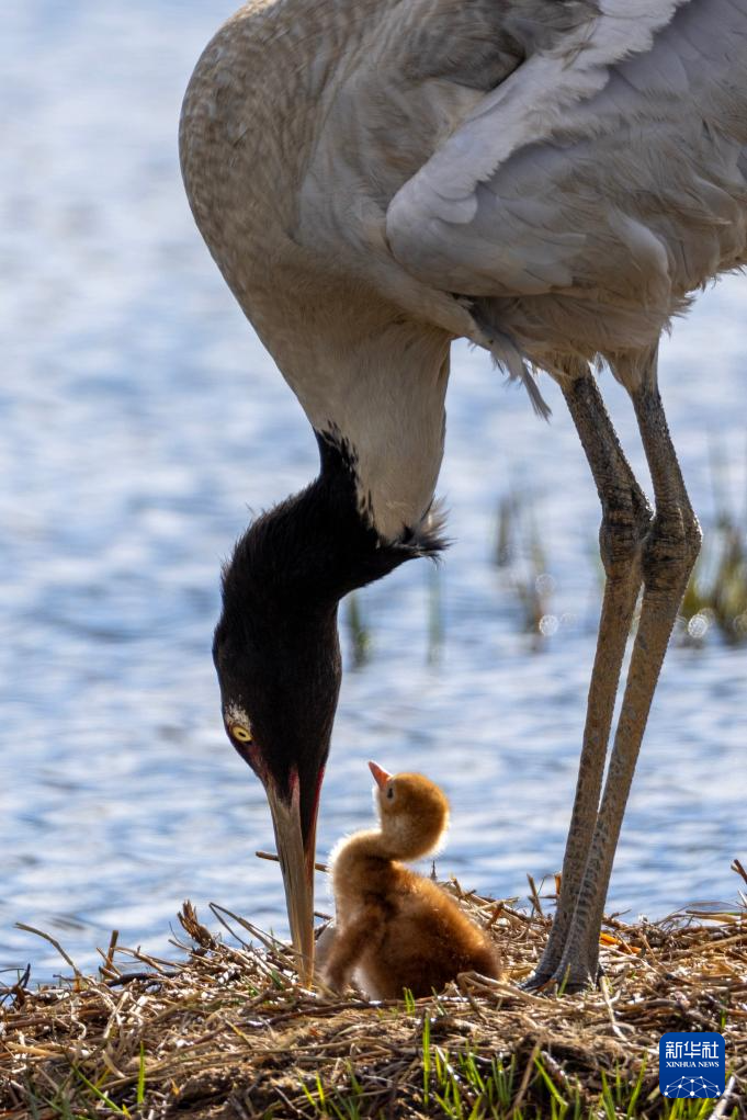 6月4日,在西藏那曲市申扎縣,一只黑頸鶴查看剛出生雛鳥的情況。新華社記者 孫瑞博 攝