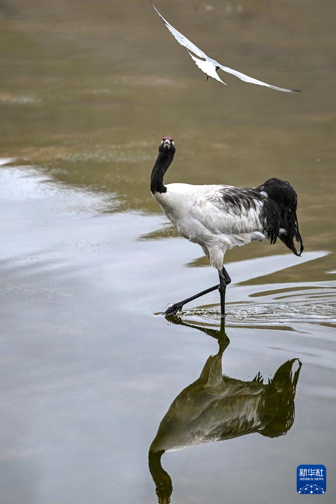 6月4日,在西藏那曲市申扎縣,一只黑頸鶴試圖驅(qū)趕鳥巢附近活動的漁鷗。新華社記者 孫瑞博 攝