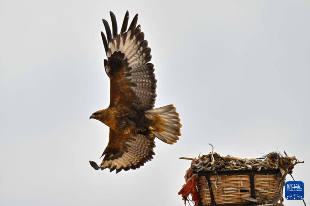 羌塘草原上的一只大鵟飛離鷹架上的巢(6月8日攝)。新華社記者 孫瑞博 攝