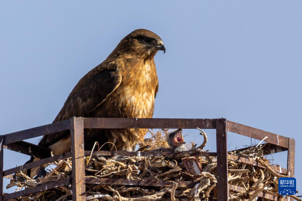 一只游隼與其雛鳥(niǎo)在鷹架上的巢中(6月8日攝)。新華社記者 姜帆 攝