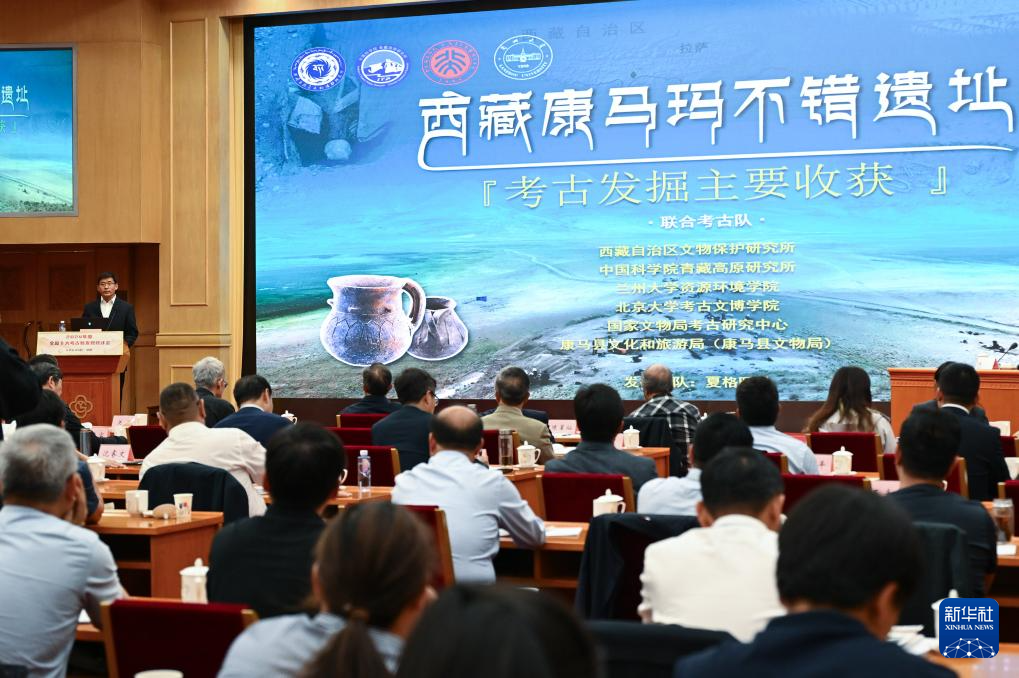 4月23日,聯(lián)合考古隊領隊夏格旺堆在“2024年度全國十大考古新發(fā)現(xiàn)”終評會現(xiàn)場向專家學者和媒體介紹瑪不錯遺址相關情況。新華社記者 李賀 攝