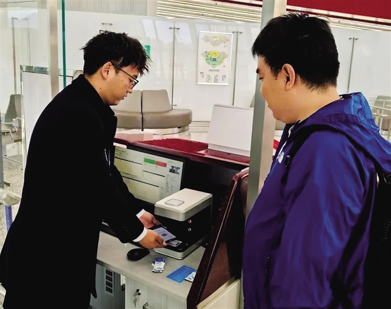 機場工作人員為游客辦理登機手續(xù)。
